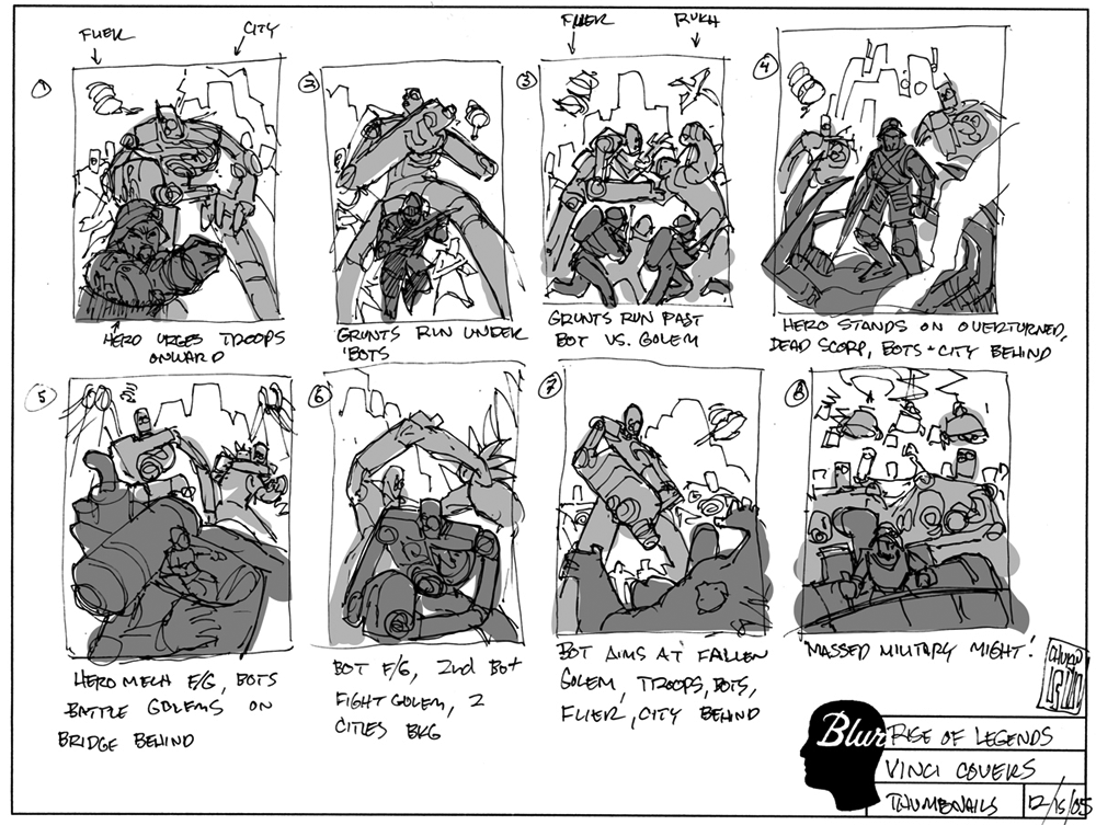 Step 1 in this kind of thing involves me wracking my brain for a bunch of quick thumbnail designs. I explore different compostions, character groupings, etc. Finally, I slap some tones on these frenetic little drawings to make 'em more readable.