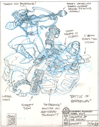 I'd eat a bug if I could design a model kit that got produced! Here's the initail sketch for a Toy Biz product that got all the way to fully toned turnaround studies before the cartoon tanked and the project got cancelled... :P