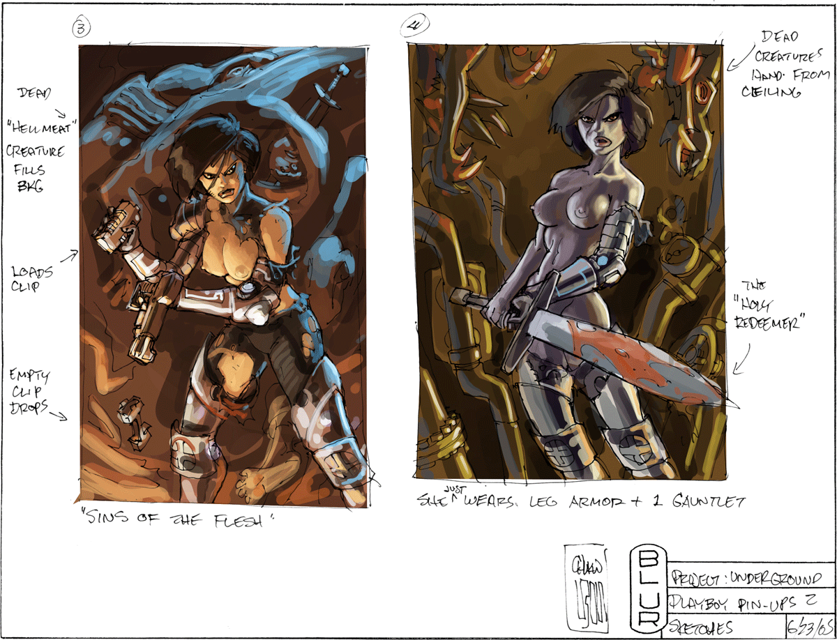 Our Creative Director felt, and I agreed, that a fresh-from-the-fight look would properly portray do this character , even in an erotic setting. The client chose a more serene scene. C'est la vie! ;)