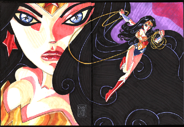 The frontispiece for a dear friend's Wonder Woman-themed sketchbook. Prismacolor markers over Micron pen.