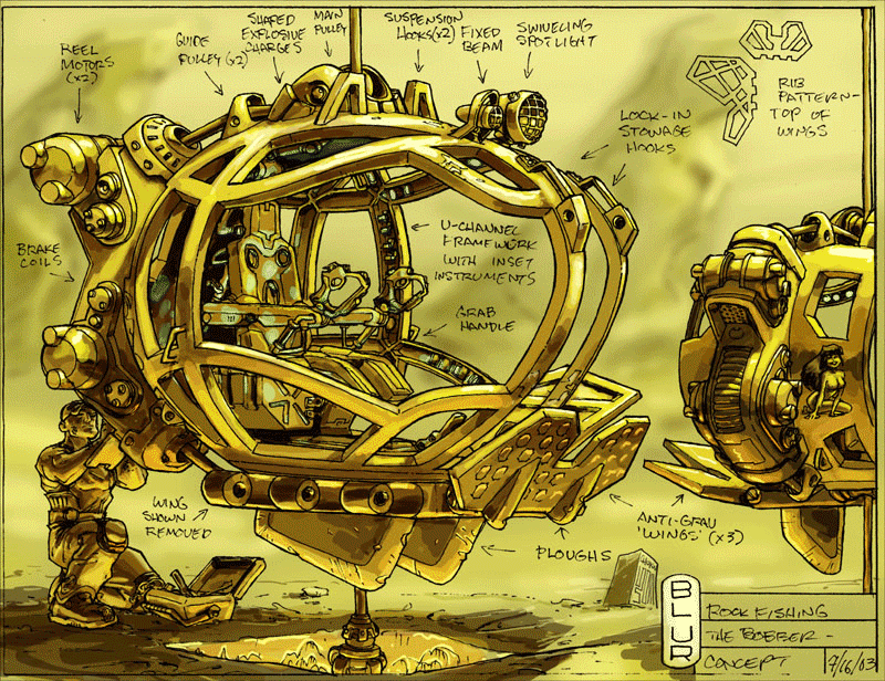 Cryus and his alien pet Argent have the ride of their lives in this fishing cage. I based the design on fancy fishing reels.