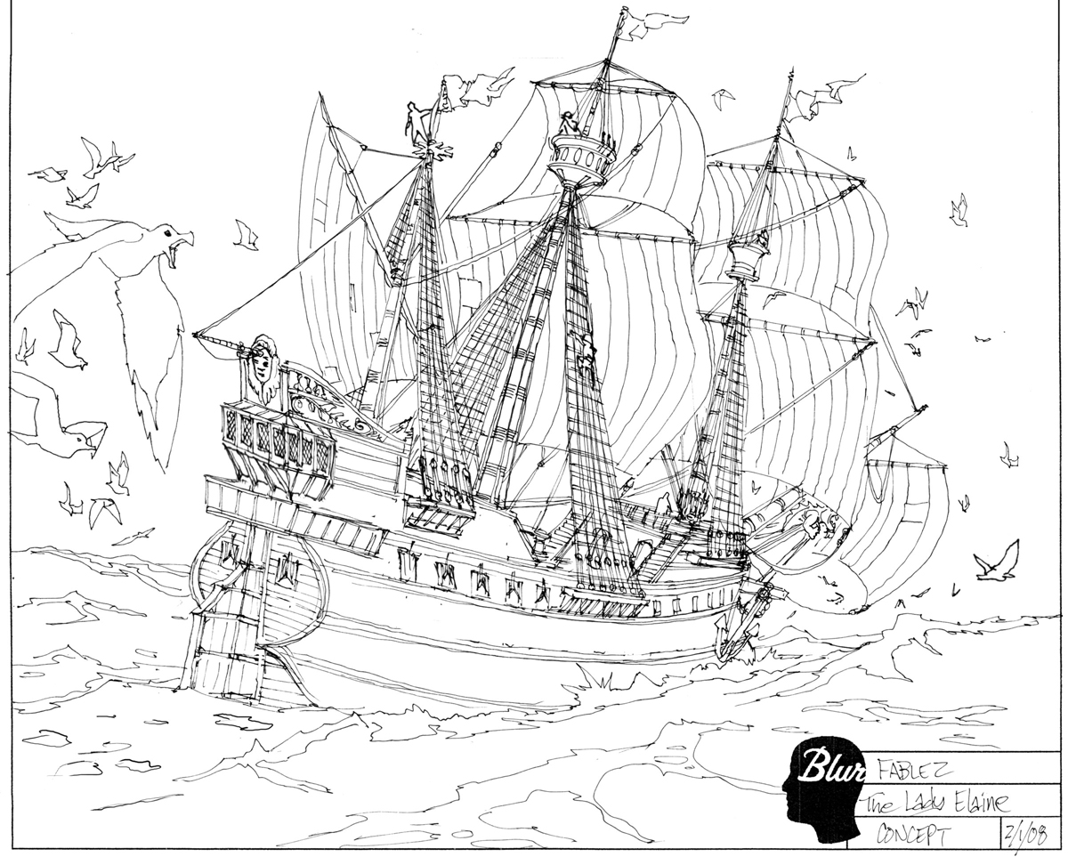 We take a momentous sea voyage in Fable II on a clasic fantasy sailing ship. This take was too large and strayed too far from the in-game version. See the next sketch for the final design used in blur's cinematic.